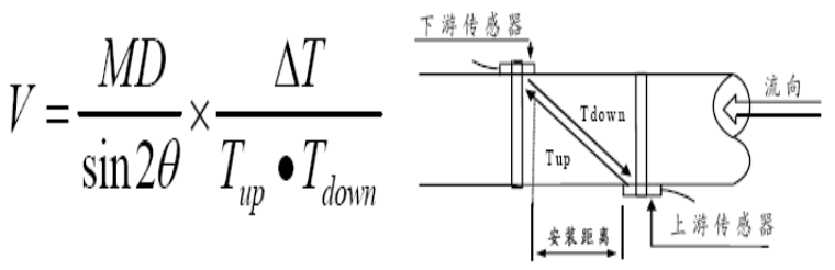 當超聲波束在液體中傳播時,液體的流動將使傳播時間產(chǎn)生微小變化,并且其傳播時間的變化正比于液體的流速,其關系符合下列表達式: